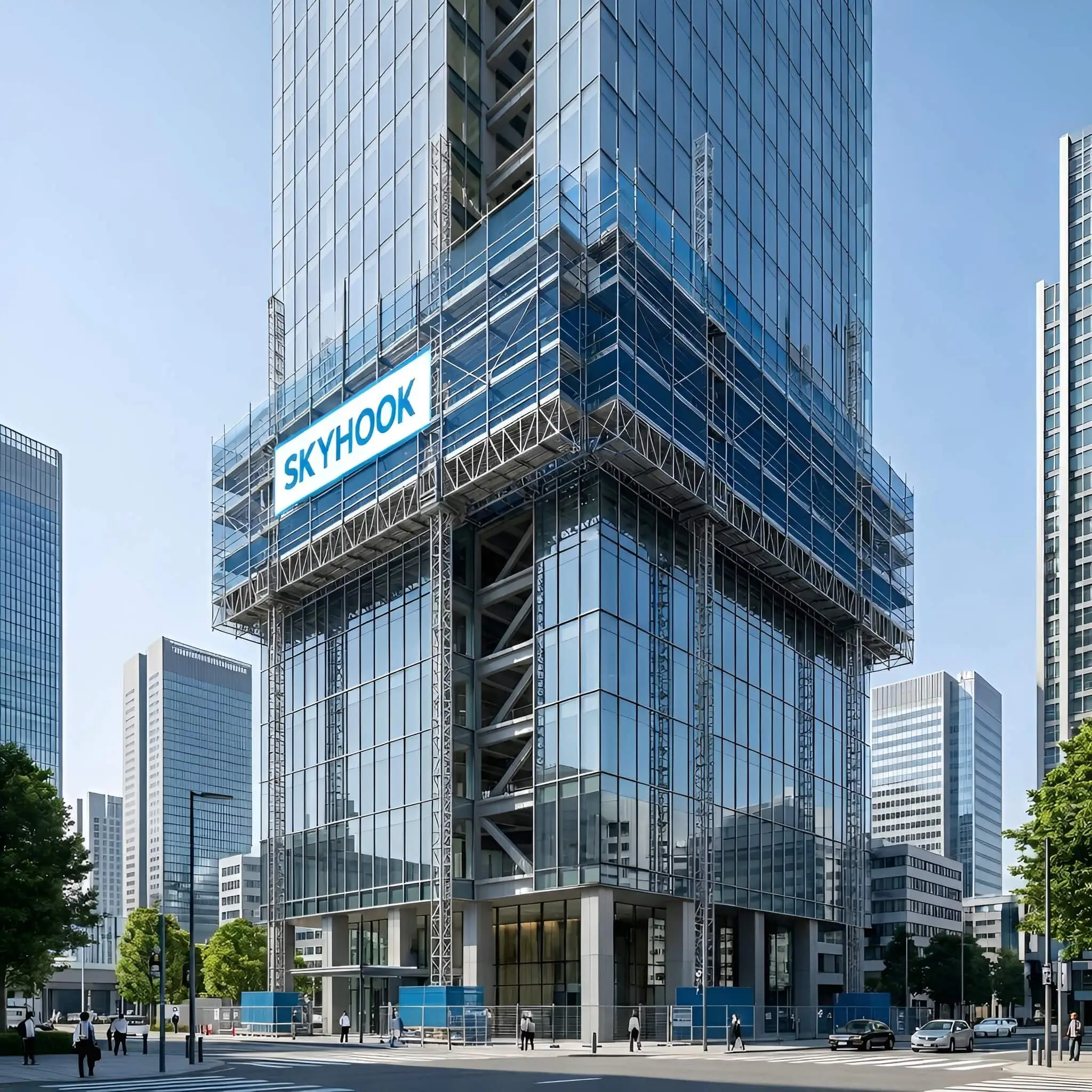 Heavy-duty facade scaffolding system for high-rise construction projects.